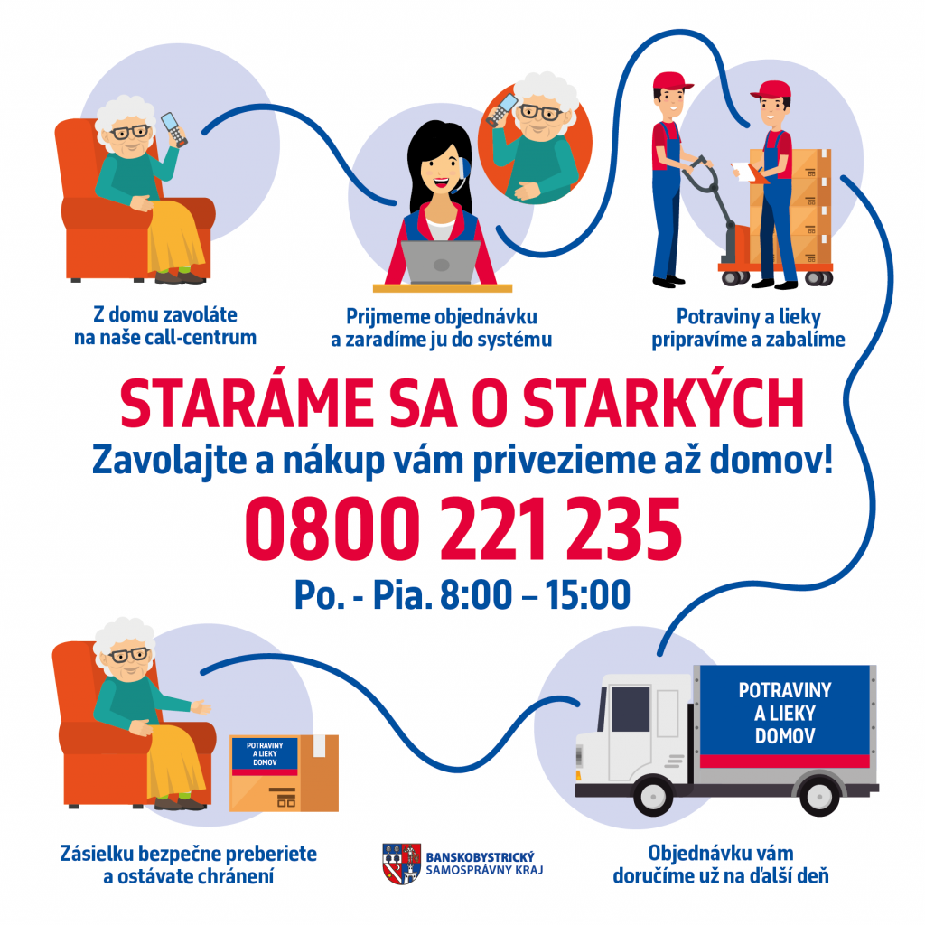 SAMOSPRÁVNY KRAJ AŽ DOMOV. VOLAJTE ZADARMO NA 0800 221 235, PONDELOK AŽ PIATOK OD 8:00 DO 15:00, NADIKTUJTE SVOJ NÁKUPNÝ ZOZNAM A ZAPLATÍTE PRI DORUČENÍ. SENIORI A RIZIKOVÉ SKUPINY ĽUDÍ, ZOSTAŇTE DOMA A NEDAJTE ŠANCU KORONAVÍRUSU. VOLAJTE 0800 221 235 A POTRAVINY VÁM ŽUPA PRIVEZIE AŽ DOMOV.